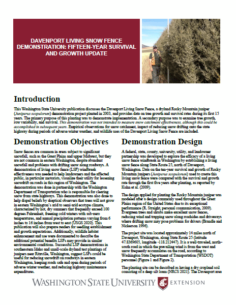This pub provides the Davenport Living Snow Fence demonstration project’s 15-year survival and growth update, empirical data, impacts, and wildlife uses.