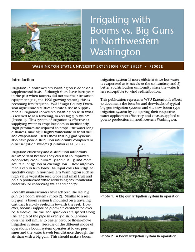 This publication compares the benefits and drawbacks of big gun and boom-type irrigation systems by documenting their respective water application efficiency and costs as applied to potato production …
