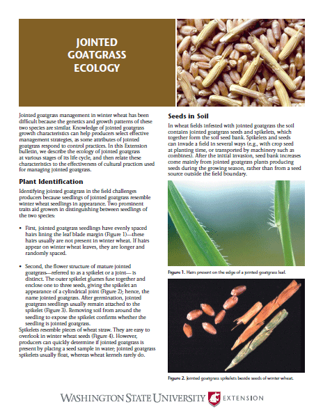 In this Extension bulletin, we describe the ecology of jointed goatgrass at various stages of its life cycle, and then relate these characteristics to the effectiveness of cultural practices used for managing jointed goatgrass.