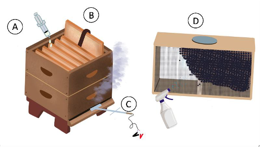 Oxalic acid can legally be applied to honey bee colonies using products registered by the EPA in several ways: solution method, often referred to as dribbling (Figure 1A), fiberboard strips (Figure 1B), vaporization (Figure 1C), and spraying (Figure 1D). These methods should not be used concurrently. Application methods for each product are described below, but adherence to the EPA-approved label is required when applying each product.