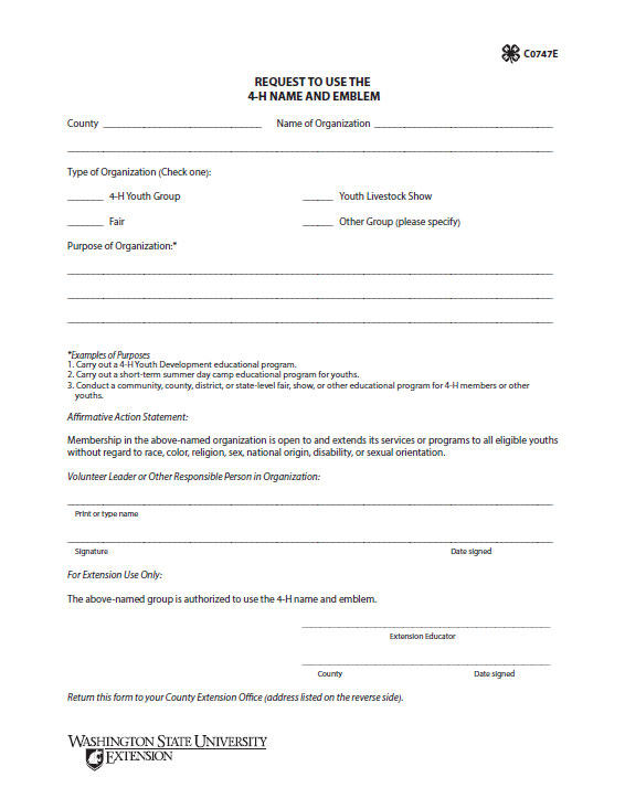 An 8.5 x 11 in. form that youth groups use to get permission to publicly identify themselves with 4-H. …