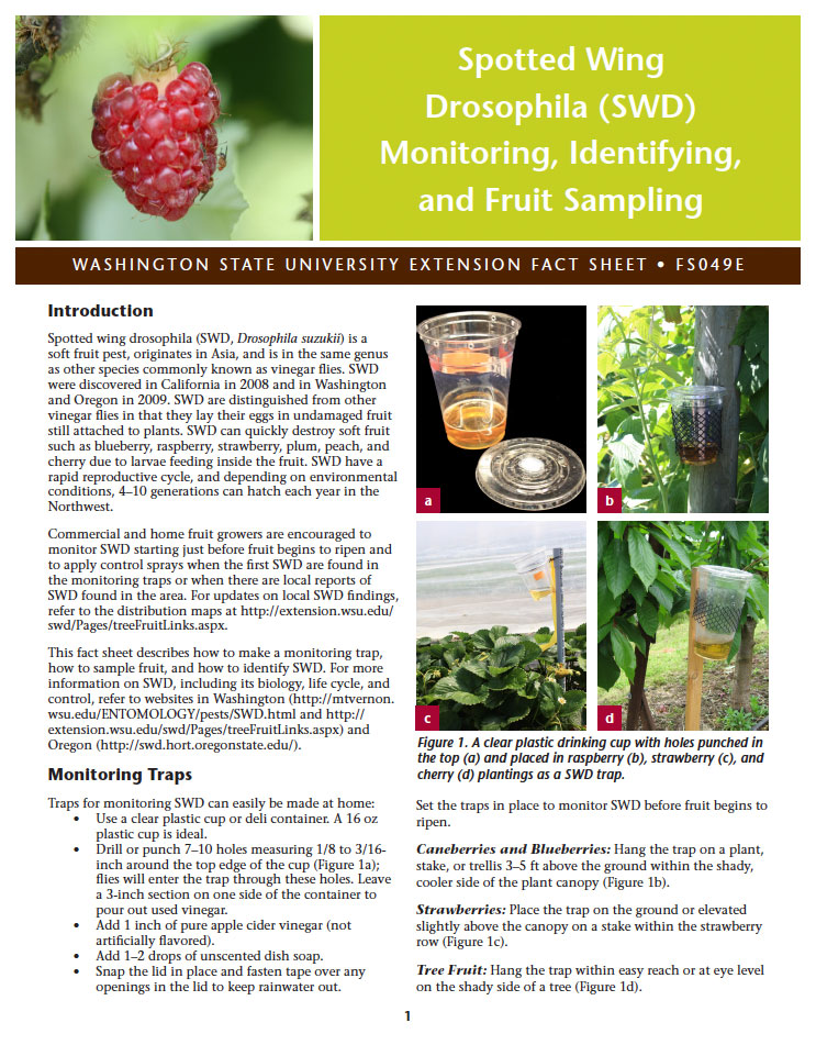 Spotted wing drosophila (SWD) is a soft fruit pest in the same genus as other species commonly known as vinegar flies. SWD were discovered in California in 2008 and in Washington and Oregon in 2009. S …