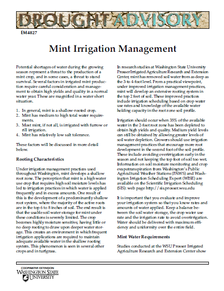 This drought advisory bulletin discusses the water requirements of mint. Since mint needs water all summer and has a shallow root system and low salt tolerance, growers have to focus on getting maximu …